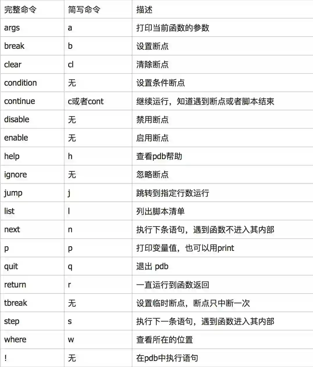 pdb 是 Python 自带的库,为 Python 提供了一种交互式的源码调试功能,包含当前调试器应有的功能,包括设置断点、单步调试、查看源码等。其实如果你之前学过 c/c++ 的话,你可能知道 gdb 这个命令行调试工具,如果你之前用过 gdb,那么恭喜你你可以直接用 pdb 了,因为这哥俩一个用法。如果你不知道 gdb 也没事,我们先来看一下 pdb 的部分调试命令(截图来自脚本之家):