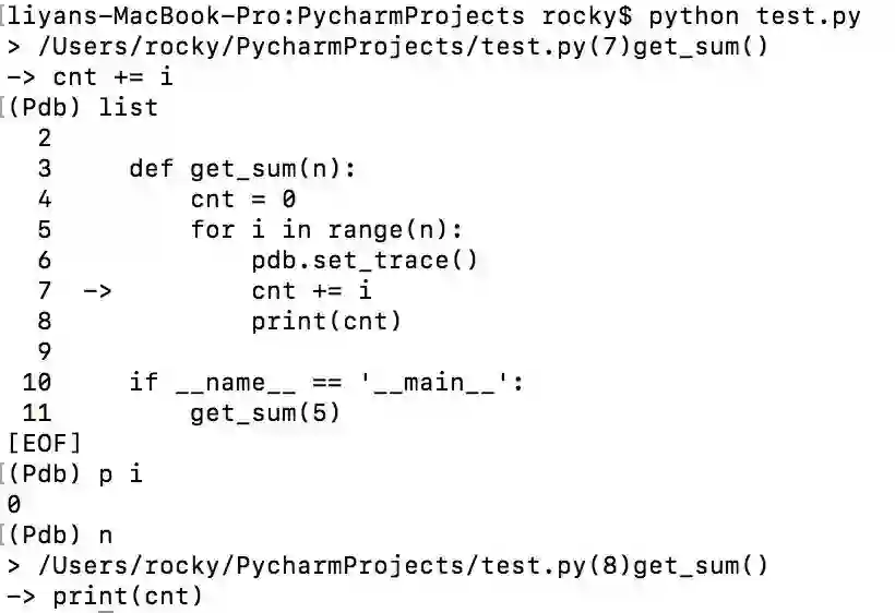 另一种是在 Python 代码中调用 pdb 模块的 set_trace 方法设置一个断点,当程序运行到此断点的时候,程序将会暂停执行并且打开 pdb 调试器,这种适合于代码文件较大的情况。具体如下所示: