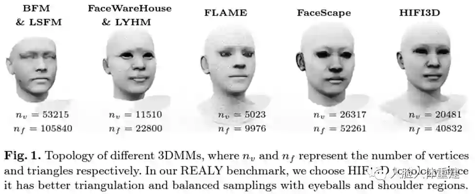在构建benchmark的过程中,我们对于一些高质量的人脸数据(Headspace, FaceScape, HIFI3D)进行了拓扑结构的统一,得到了约2000个不同性别、年龄、种族的人脸mesh,在此基础上,我们构建了一个全头人脸3DMM并命名为HIFI3D++,不仅包含脸部区域,还包含脖子、眼球、口腔,不同拓扑结构的比较如图1所示。
