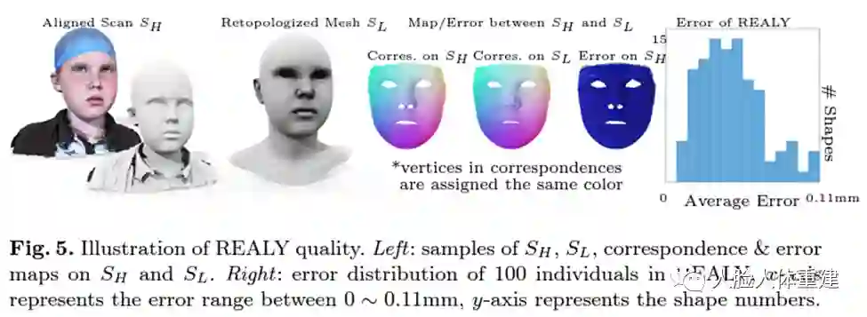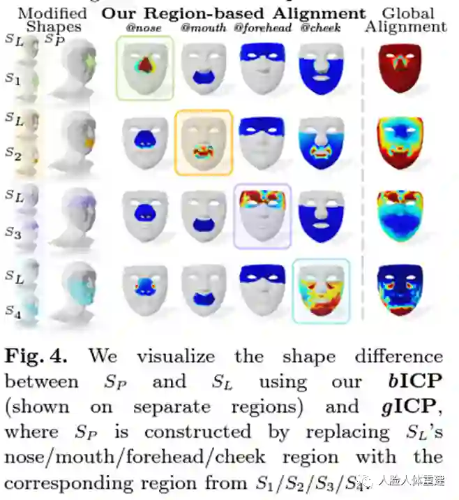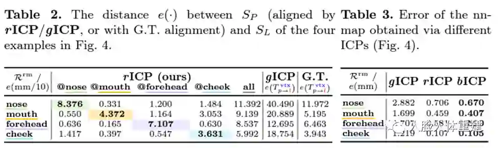 从表3来看,我们的对应点计算策略带来的误差要显著小于全局对齐后最近点获得的对应点。实验结果表明,我们的评价流程不仅能够聚焦到脸部区域有差异的部分(图4和表2的对角线),并且我们的对应关系建立更加准确(表3)。