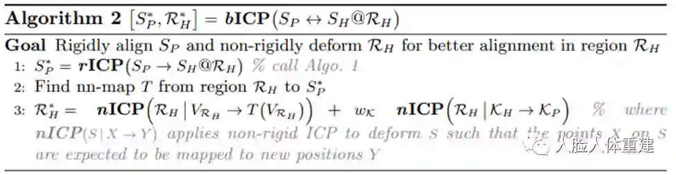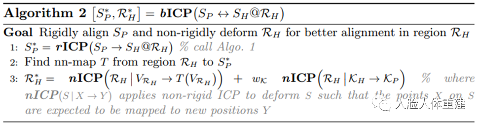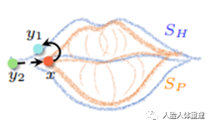 如图所示,对于predicted mesh上的某一点x,在计算误差时需要找到ground-truth scan上的对应点,若通过点到平面的最近距离建立对应关系,则可能为y1。这时,虽然y1是x距离最近的点,然而他们在语义信息上没有关联性,与嘴角的点x相关联的应该是y2,然而y2不会是x所对应的最近点。在这样的情况下,虽然计算得到的误差较小,但由于对应点之间的语义信息并不一致,因此计算得到的误差并不靠谱,较小的误差并不能表明较大的相似度。对此我们提出使用一步额外反方向非刚性对齐,并且其中增加了包含有语义信息的关键点损失,从而得到语义上更加一致的对应关系。