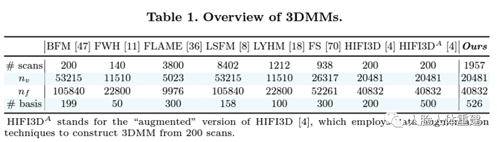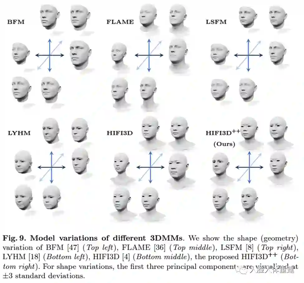 表1统计了开源的3DMM与HIFI3D++的基本信息,图9则显示了不同3DMM的variation,我们的RGB(-D) Fitting实验也证明了HIFI3D++在表达能力上优于先前的3DMM。
