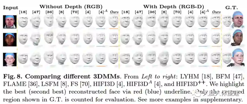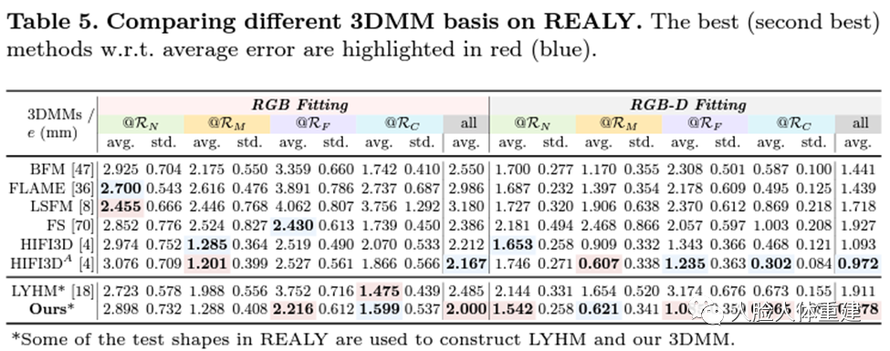借助REALY benchmark,本文采用RGB(-D) Fitting的方式对不同3DMM的表达能力进行了评价,定量与定性的比较如表5和图8所示。