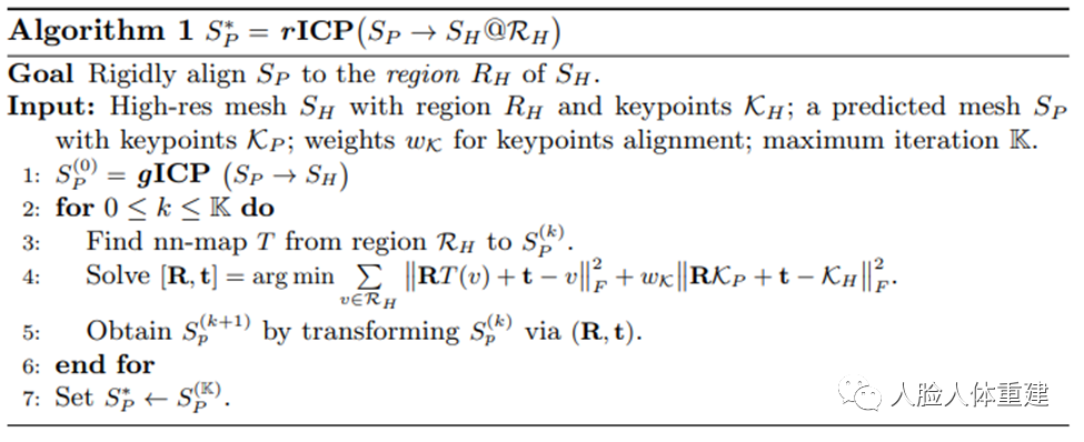 具体而言,我们首先通过最近点建立初步的对应关系;随后借助non-rigid ICP将ground-truth scan某一区域变形到predicted mesh上,由于变形后的区域与predicted mesh已经贴合,因为在变形过程中考虑了具备语义信息的关键点损失,所以这时的对应关系相比于原始的最近点的对应关系具有更好的语义关系的一致性(如,图3中脸部关键点的一致性),从而我们对初始的对应关系进行更新;最后,由于变形前后的拓扑形状的一致性,我们能够借助更新后的对应关系计算原始的ground-truth scan区域与局部对齐的mesh之间的最终误差。