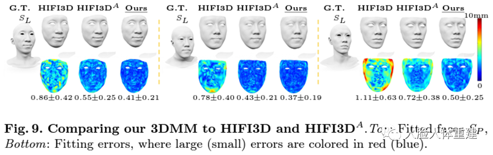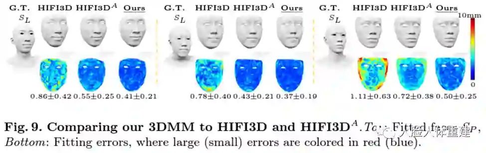 为了进一步证明HIFI3D++的表达能力,我们只用顶点损失,根据最小二乘的方式拟合一组mesh,对HIFI3D/HIFI3D(A)/HIFI3D++进行比较,如图9所示。