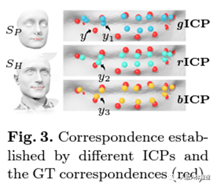 通过本文提出的评价流程,我们能够建立语义信息更一致的对应关系,从而提升最终评价结果的可靠性。直观而言,如图所示,对于ground-truth scan嘴部区域的关键点,我们分别比较了predicted mesh使用先前的对齐方法(gICP),以及本文提出的基于区域的对齐方法(rICP)以及基于形变的关键点更新策略(bICP)在ground-truth scan上找到的对应点与真实的嘴部关键点的差异,可以发现,我们的方法建立的关键点与真实的关键点更加接近,因此这时的误差最能体现真实的相似性。