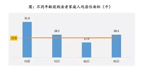 从年龄划分来看的话,报告称,相较于资金积累薄弱的90后,80后的居住空间更狭小些。数据显示,家里普遍有“红领巾”的他们人均居住面积为27平方米,相当于三口之家住房不到60平方米,在各年龄段中居住条件属于最差。