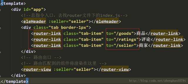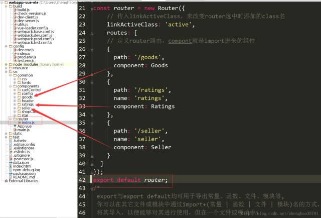 通过import导入并定义Vue模块、vue-router模块和需要使用的组件,在本例中,分别是Goods、Ratings和Seller组件。最后,如果在一个模块化工程中使用它,必须要通过 Vue.use() 明确地安装路由功能。