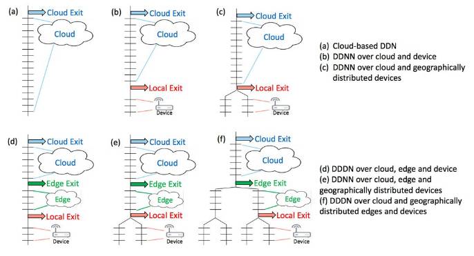 图 2:DDNN 架构的概览。垂直线表示 DNN 通道,连接水平线(神经网络层)。(a) 是标准的深度神经网络(完全在云端处理);(b)是引入了终端设备和本地出口点(exit point),可能分类云之前的样本;(c)是(b)的扩展,增加了多个终端设备,聚合在一起进行分类;(d) 和(e)是(b) 和(c)的拓展,增加了云与终端设备之间的边缘层;(f)展示了边缘也能像终端设备一样被分布。