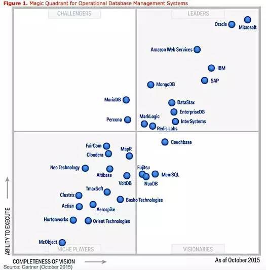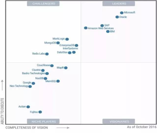 在谈论OceanBase未来的时候,我想先聊聊上面这三张图。这是Gartner的魔力象限图,对最近三年操作型数据库管理系统的分析。有意思的是,2015年收录了31家公司,其中一大堆领导者;第二年还有21个,基本上领导者就只剩下微软SQL Server,Oracle,SAP,亚马逊和IBM了,去掉了一半不赢利(死掉)的;到了2017年,只剩下11家,微软和Oracle仍然稳如磐石,亚马逊继续上升,SAP落到第四,IBM与前三名差距拉大。因为推出了Spanner,谷歌从一招鲜玩家杀入到远见者。因为不赢利,MongoDB居然都能被干掉。从上面可以看到,在数据库这样一个非常成熟的细分领域里,最近三年居然产生了如此剧烈的变化,这意味着什么?会不会像当年分布式计算和虚拟化催生了云计算一样,数据库领域也会产生类似的变化?这一现象背后的趋势,值得我们深思。