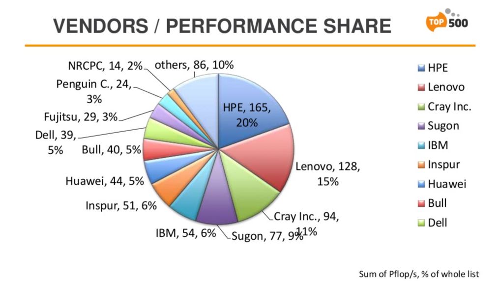 ▲截至2017年12月,HPC Top500供应商计算性能份额排名