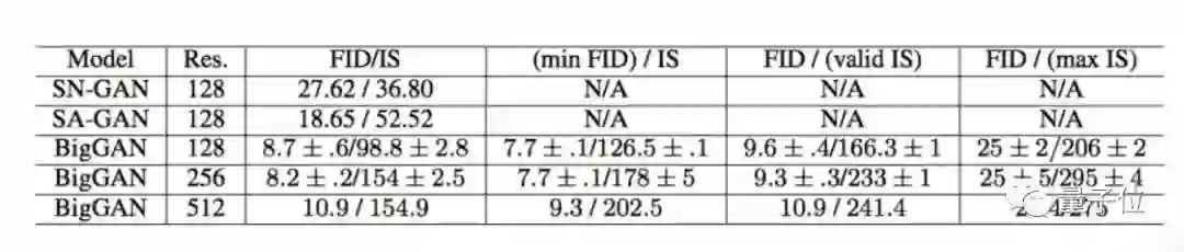 在计算机图像研究史上,BigGAN的效果比前人进步了一大截。比如在ImageNet上进行128×128分辨率的训练后,它的Inception Score(IS)得分166.3,是之前最佳得分52.52分3倍。