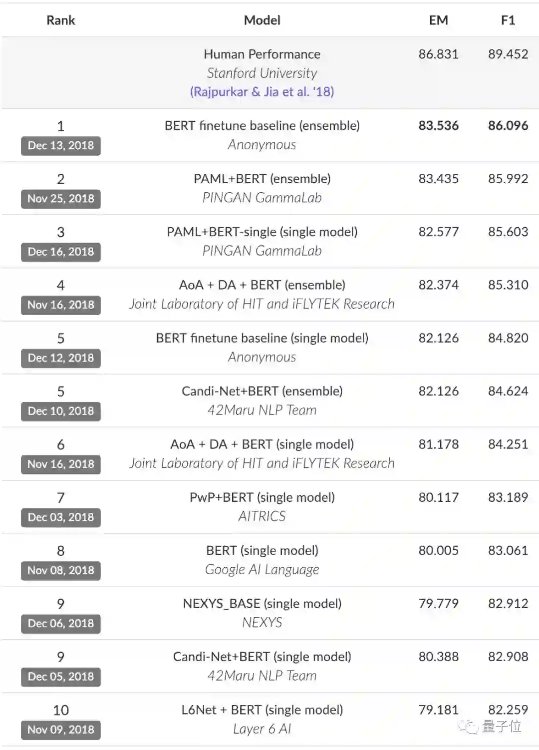从性能上来看,没有哪个模型能与BERT一战。它在11项NLP任务上都取得了最顶尖成绩,到现在,SQuAD 2.0前10名只有一个不是BERT变体: