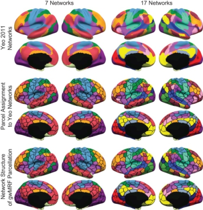 人脑皮层功能网络架构及其精细图谱划分。第一行展示人脑皮层大尺度(七和十七)网络架构,第二行展示的马尔科夫随机场赋予的400皮层精细图谱与大尺度网络的空间重叠率,第三行展示了精细化脑图谱聚类结果与大尺度脑网络关系。