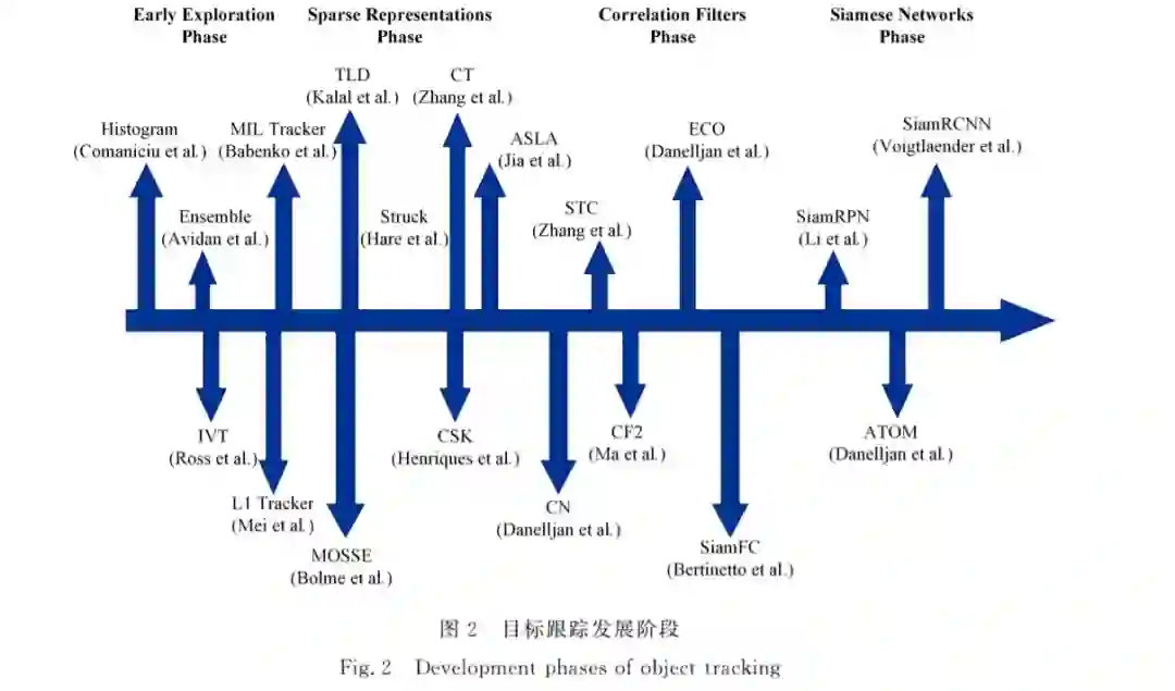 目标跟踪领域涌现出了大批经典算法[3G21],具体如图2所示. 本文分4个阶段对目标跟踪的发展进行综述,即早期的目标 跟踪探索阶段、稀疏表示阶段、相关滤波阶段和孪生网络阶 段,主 要 介 绍 的 跟 踪 算 法 包 括 Histogram [3],Ensemble [4], IVT [5],MIL [6],L1Tracker [7],TLD [8],MOSSE [9],Struck [10], ASLA [11],CT [12],CSK (KCF)[13],CN [14],STC [15],CF2 [16]ECO [17],SiamFC [18],SiamRPN [19],ATOM [20],SiamRCNN [21]等. 本文详细梳理了最近几年目标跟踪领域的相关工作,并 将其分为了五大类:数据集和评价标准的改进、目标跟踪基本 框架改进、目标表示的改进、空间上下文方面的改进和时序上 下文方面的改进.对上述5类工作分别进行介绍和分析之后 得出本文的结论,并提出未来目标跟踪领域可能的发展趋势.
