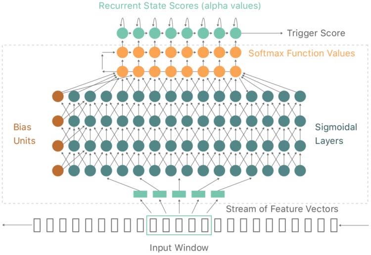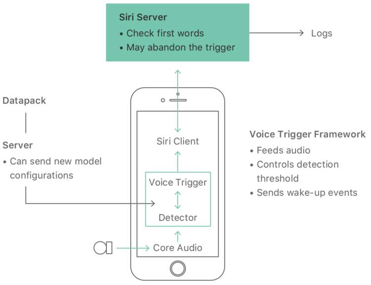 iPhone 或 Apple Watch 激活 Siri 不仅要求快速准确,还要求不会对电池的寿命产生重大的影响以及尽可能少的占用内存和处理器。为了避免主处理器一直处于检测触发词的状态,iPhone 中的 AOP(一种小且低能耗的处理器)会使用其一小部分处理能力来运行一个探测器和一个小版本的声学模型。当信度分数超过最低阈值时,AOP 会「提醒」主处理器进行下一步操作。