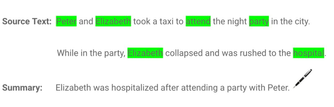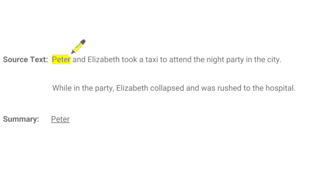 如上例所示,抽取式摘要由荧光笔标黄的单词组成,生成摘要的语法可能不准确。
