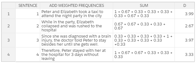 根据所有单词的加权频率总和,我们可以推导出:第一个句子在整段话中的权重最大。所以,第一个句子能够对这段话的意思作出最具代表性的总结。