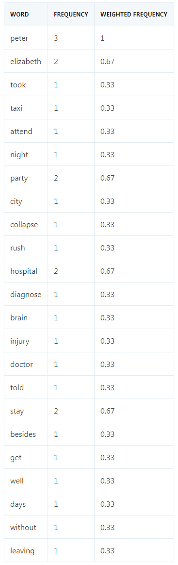 紧接着,我们计算所有单词的加权出现频率。为此,我们用每个单词的出现频率除以这段话中出现最多次的单词的频率,在这段话中出现最多的是 Peter,总共出现了三次。