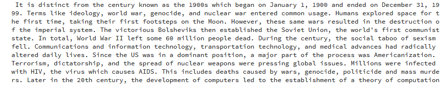 如你所见,运行代码可以对冗长的 Wikipedia 文章进行总结,并简要概述 20 世纪发生的主要事件。