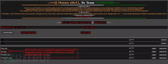 Web shell显示psexec正在远程Windows AD域控机器上执行命令。如果一切顺利,我们将在目录“C:\xampp\htdocs\box\ps”中获取到一个名为“out.txt”的文件,它将包含在AD域控(192.168.56.200)上执行的“vssadmin list shadows”命令的输出。