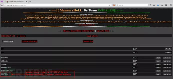 psexec文件将远程执行Windows AD域控计算机上的vssadmin命令。在创建“C”盘卷影副本之后,我们需要将“ntds.dit”和“SYSTEM”文件从该卷影副本复制到我们具有Web shell访问权限的机器上,即Windows域机器“LABONE”。这个任务可以通过使用“psexec”来完成,我们只需在“copy”命令中指定目标AD域控机器的IP,域管理员用户名和密码即可,请使用SMB将ndts.dit和SYSTEM文件从卷影副本复制到LABONE机器。这里,我将这些文件复制到了我转储psexec文件的同一目录下。