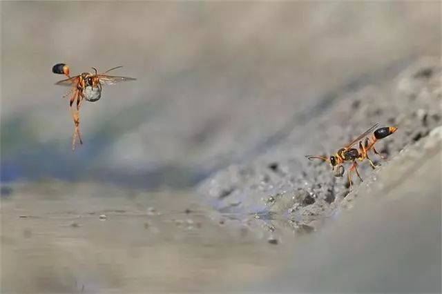 2只雌性泥蜂在为产卵收集泥球,当泥球数量足够时,它们就会在里面挖出自己的产房。不过在此之前,它们会先捕捉足够数量的蜘蛛,将其瘫痪后储藏起来,作为产卵前的最后一顿大餐。这种生物既美丽,又可怕,正因如此,这张鲜活的照片是伦敦自然历史博物馆2018年度野生动物摄影师大赛无脊椎动物行为类当之无愧的赢家。