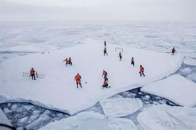今年3月,挪威海洋研究所科学家和一艘破冰船的船员举行了一项高风险运动——北极足球。几个人在格陵兰岛附近一块比篮球场大不了多少的浮冰上奔跑追逐,还有几个人在边上监视着北极熊。更引人注目的是,在画面当中的几平方公里海面上,他们所在的冰面已经是最大的,周围都是碎冰,全球变暖的影响可见一斑。