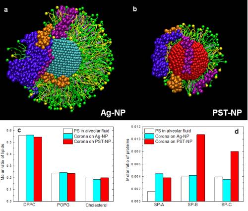 图2. 两种典型纳米颗粒(亲水银颗粒和疏水聚苯乙烯颗粒)上所形成肺表面活性剂冕的结构和组分