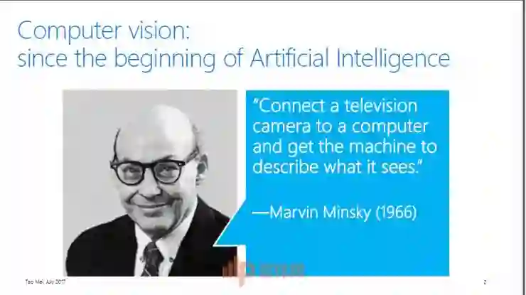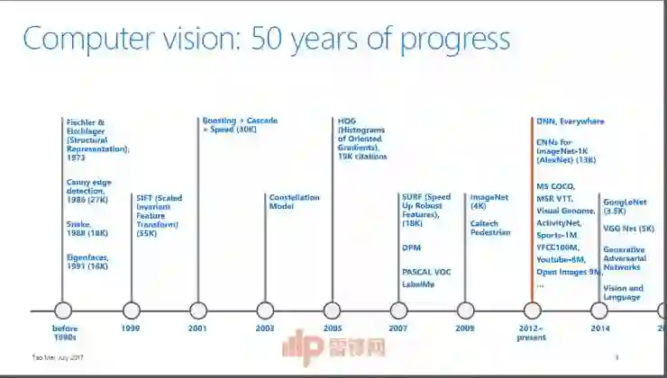 大家可以从这个图中看到CV的一些进展,举几个例子,比如说这篇论文SIFT(Scaled Invariant Feature Transform)文,已经被引用55000次了。另外,如果大家做人脸识别就会知道,需要定位人脸的区域。我们2001年有一个方法是Boosting +Cascade,做快速的人脸定位。到今天为止,虽然大家知道做人脸定位有很多深度学习的方法,但是这个方法依然是最先的必经的步骤之一。这个论文到目前为止已被引用了30000次,在学术界有一篇论文被引用超过10000次已经是相当了不起了。到了2012年以后,基本上所有人都在用深度学习,从Hinton的学生用AlexNet在ImageNet上面能得到近乎15%的错误率,从那开始,所有视觉的东西都在用CNN,代表性的有GoogLeNet,AlexNet等等,我们的任务也会越来越多,越来越有挑战,比如现在正在做的从图片中生成语言,不仅要在图片或视频中打上一些标签,还要把这些标签变成能用自然语言描述的一句话。