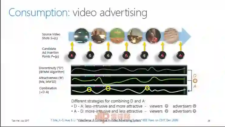 视频的消费往往和广告紧密相关。梅涛提到,做视频广告有两个问题需要解决:第一个问题是广告到底放在视频的什么位置;第二个问题是选什么样的广告,这个广告跟你插入点的信息是不是相关,使得用户接受度更加好。
