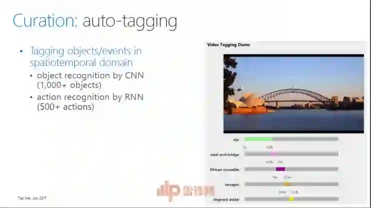 为了解决这一问题,梅涛博士表示,团队最近借用ResNet的思想,将3D CNN的层数做到了199,识别率能在UCF 101数据集上比之前的3D CNN提高6到7个百分点。这一对视频进行自动标签的技术,将会被用在微软的Azure云服务中。