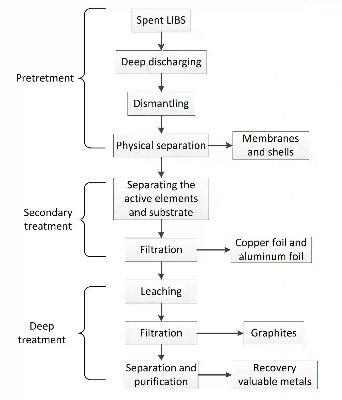 对废旧锂离子动力电池回收与处理,目的是有效分离电池各组分,提取纯化电池中的有价金属,同时减小废弃物对环境的污染。在过去的十年时间里,有大量的文献和专利来介绍废旧锂离子动力电池回收 [6][7]。通过对文献资料进行总结,归纳出废旧锂离子动力电池回收过程主要分为以下三个步骤(如图 3 所示):预处理、二次处理和深度处理。
