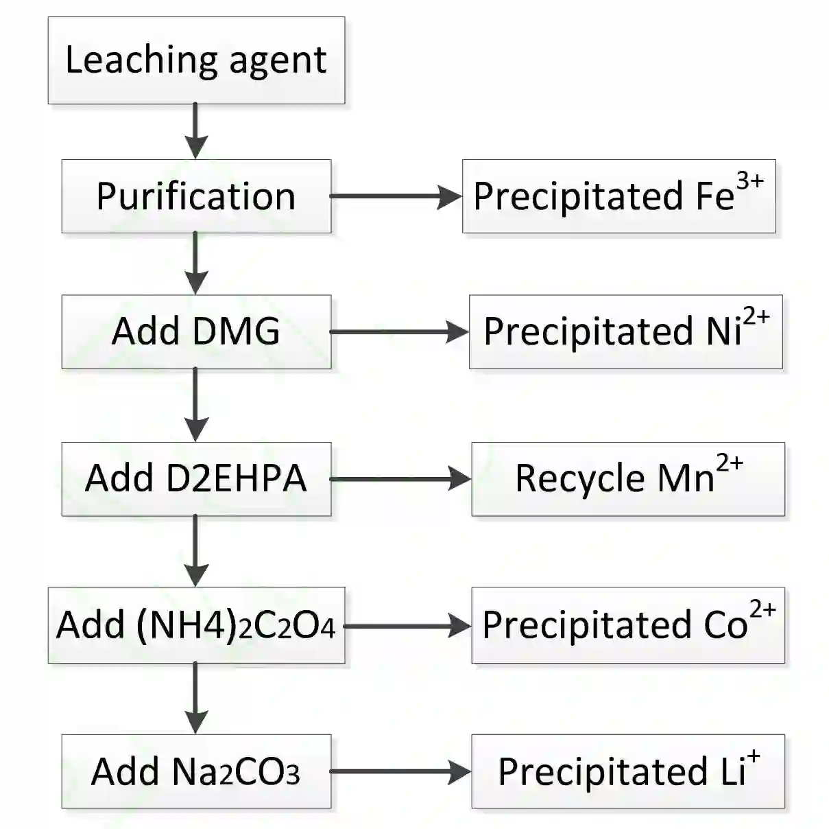 分离提纯过程主要有化学沉淀法,溶剂萃取法,电化学法,目的在于对浸出液中的重金属离子(Co2+、Li+、Ni2+、Mn2+、Cu2+、Al3+等)进行分离提纯回收。