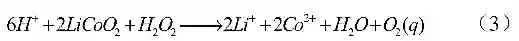 酸浸法是应用很广泛的一种浸出方法,很多研究报道通过运用无机酸(盐酸[30],硫酸[31],硝酸[32])和有机酸(柠檬酸,草酸,抗坏血酸,葡萄酸等)来浸出锂离子动力电池正极材料。由于 Co3+ 难溶,因此一般需要添加 H2O2 作为还原剂,以 LiCoO2 为例,化学反应方程式如公式(3)所示: