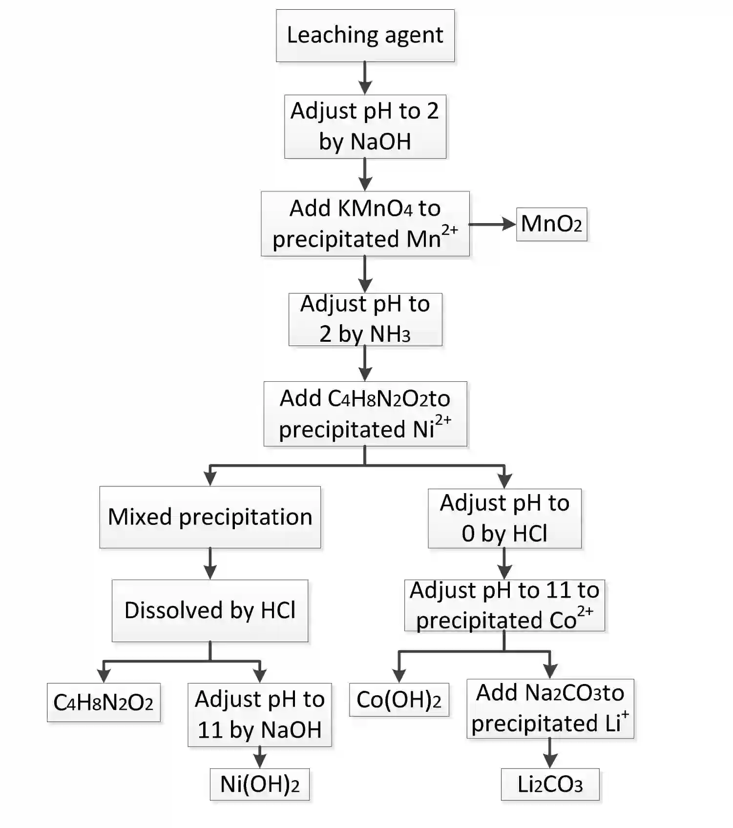 化学沉淀法是向浸出液中添加特定的沉淀剂[43],将浸出液中的金属离子沉淀出来,得到相应的金属化合物产品。化学沉淀法的核心是控制好溶液的 pH,在不同的 pH 下,沉淀出相应的金属离子。常见的沉淀剂有氢氧化钠(NaOH)、高锰酸钾(KMnO4)、草酸铵((NH4)2C2O4)、丁二酮肟(C4H8N2O2)、碳酸钠(Na2CO3)等。