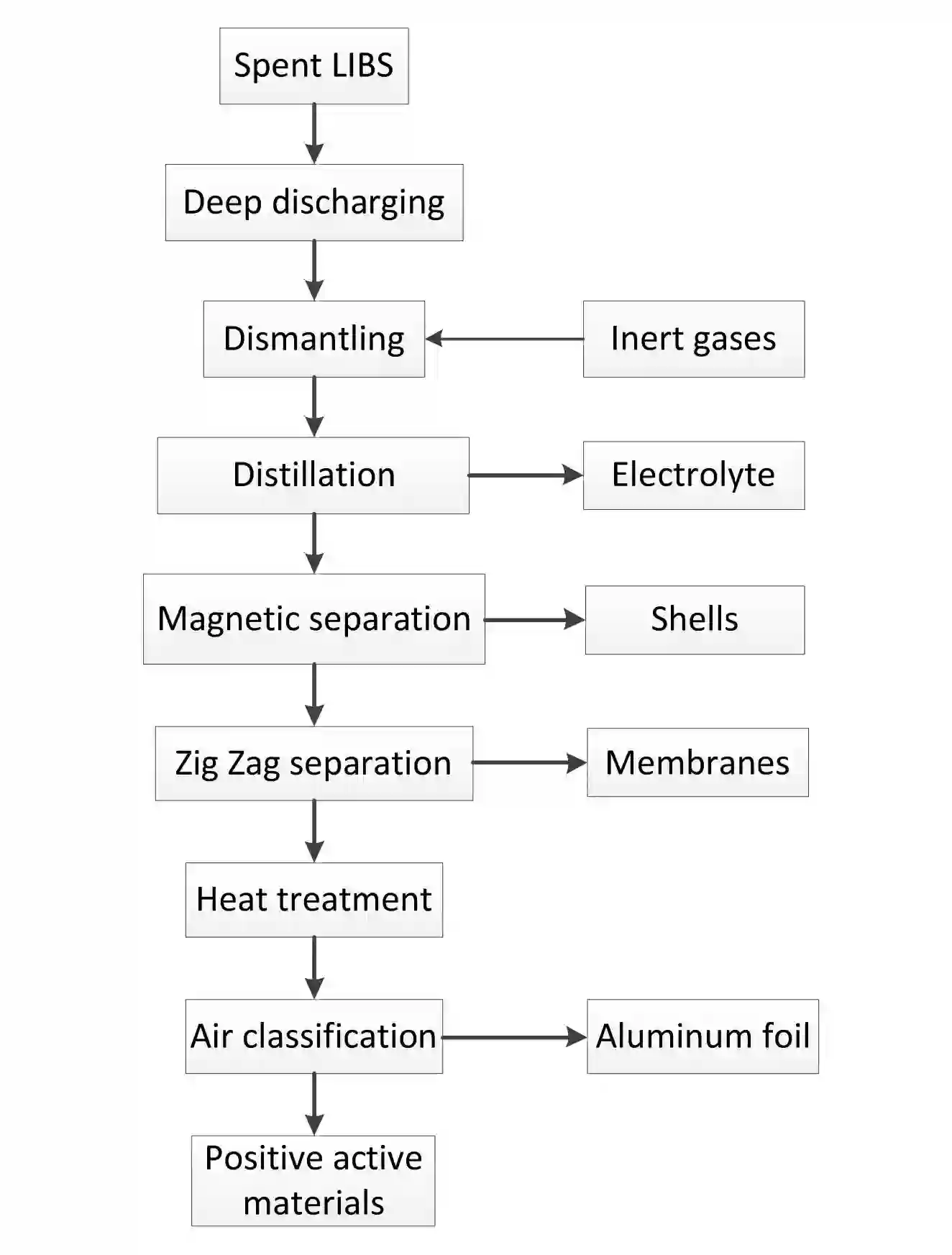 Christian 等 [20] 提出了一种新型的回收废旧锂离子动力电池的方法(如图 4 所示)。首先在惰性气体中将废旧锂离子动力电池破碎,接着将得到的电池碎片蒸馏,挥发出来的气体冷凝后回收,接着通过磁选的方式分选出外壳,选用 ZigZag 分选机分选出隔膜,然后将电池碎片置于马弗炉中焙烧,最后将焙烧后的电池碎片送入特定的风选机中分选, 97.1% 的正极材料能从铝箔上脱落。