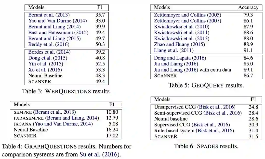 与其他方法相比,该模型没有使用外部的解析器(如 dependency parser)以及手工设计的 CCG 文法,而是采用了基于状态转移(transition-based)的方法生成谓词-参数(predicate-argument)形式的中间表达,由此避免了生成不规范形式的语义表达。