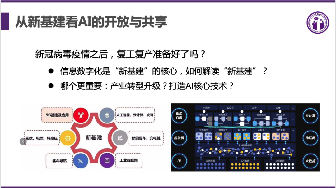 相信通过新一轮的新基建,会催生更多的新技术、新产品、新产业,有可能会有很多企业成为更大的巨无霸公司。在国家的规划当中,是希望实现人工智能总体技术发展和应用,通过新基建的推动实现与世界领先同步,催生更多的经济增长点,实现产业全面转型和加速打造。围绕 AI 核心技术做的新基建非常重要,全面产业转型依赖于 AI 打造核心技术,AI 赋能传统产业。AI 有两类,一类是新型 AI 技术公司,一类是用 AI 技术赋能传统企业,让传统企业焕发第二春。AI 技术具有很大的引领性、创新性,可以为产业转型提供更大的驱动力,也会创造更多的产业机会。