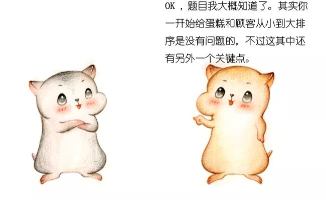 接下来,让每一个蛋糕和顾客按照从左到右的顺序匹配。如果蛋糕大于顾客饭量,则切分蛋糕;如果蛋糕小于顾客饭量,则丢弃该蛋糕。