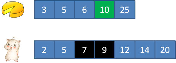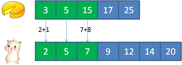 public static int findMaxFeed(int[] cakes, int[] mouths){