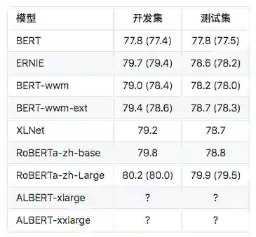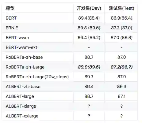注:BERT-wwm-ext来自于这里;XLNet来自于这里; RoBERTa-zh-base,指12层RoBERTa中文模型