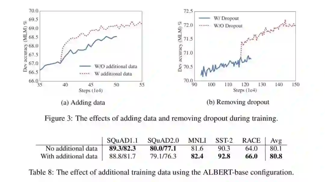 作为比较,roberta_zh预训练产生了2.5亿个训练数据、序列长度为256。由于albert_zh预训练生成的训练数据更多、使用的序列长度更长,