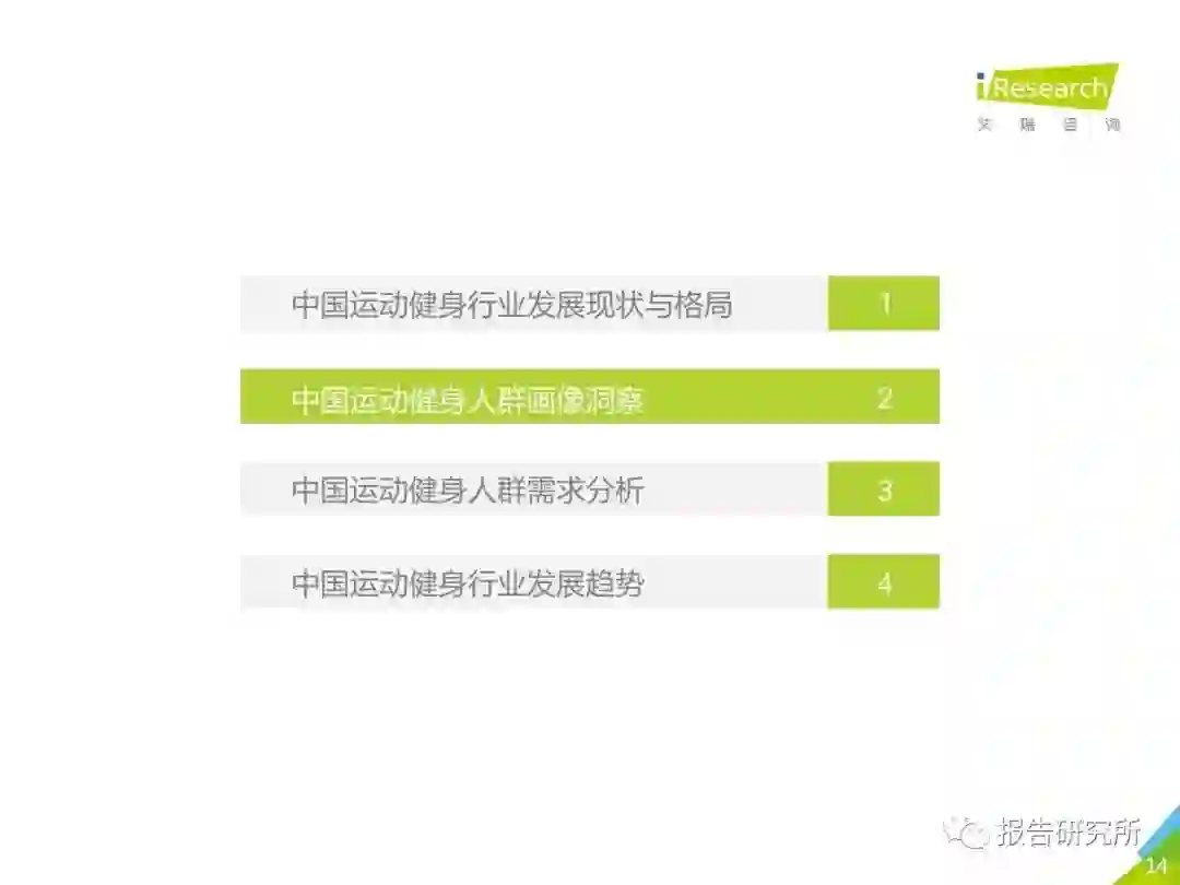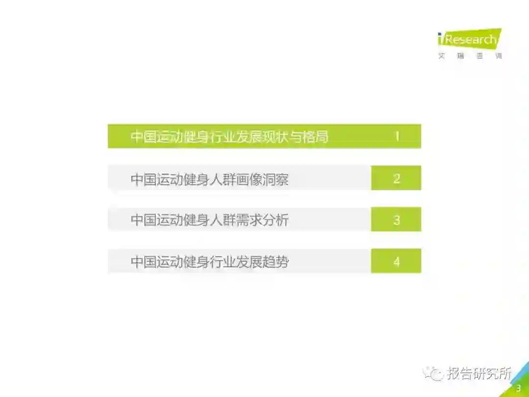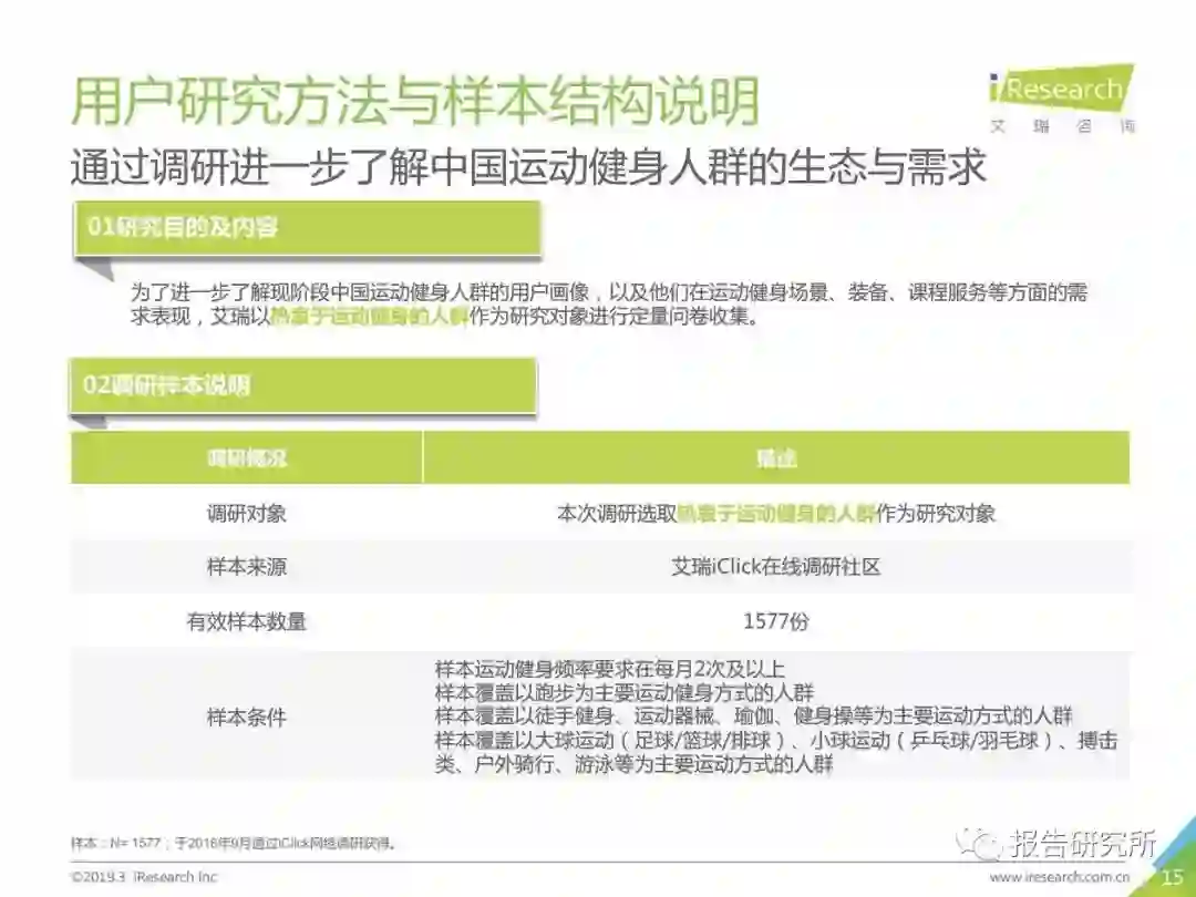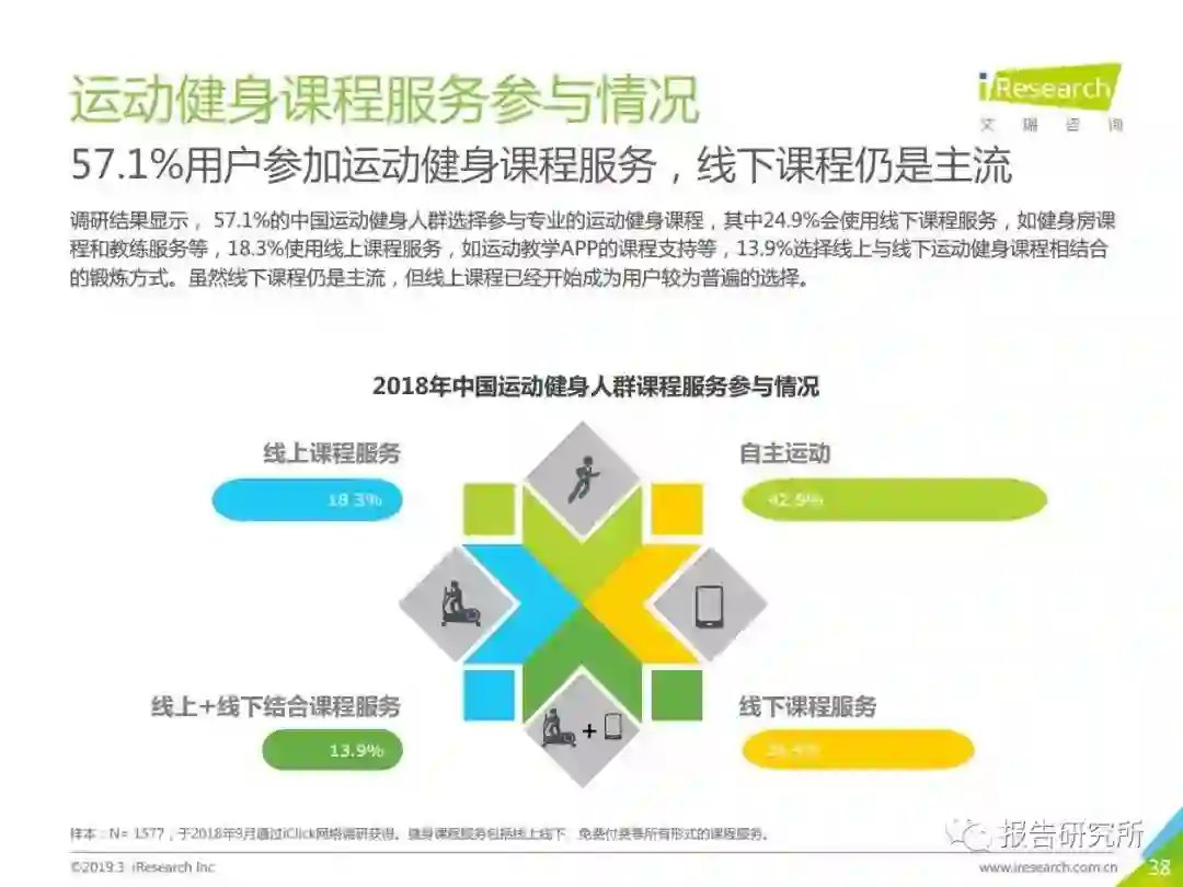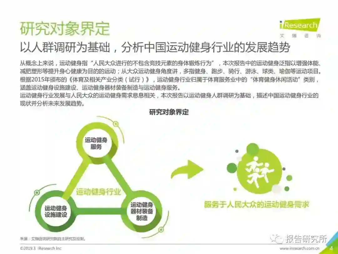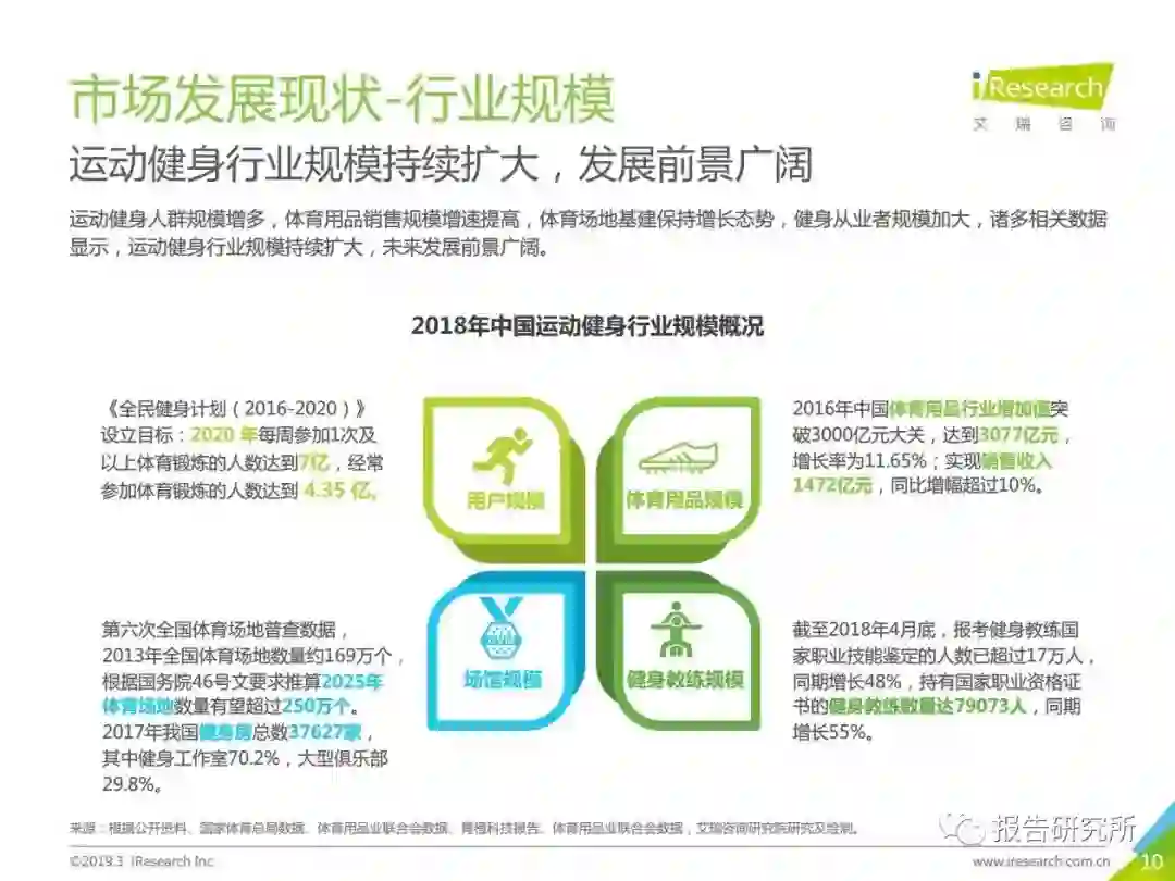 报告从行业总体健身行业概览、健身房竞争格局,和用户健身消费行为三个方面研究。