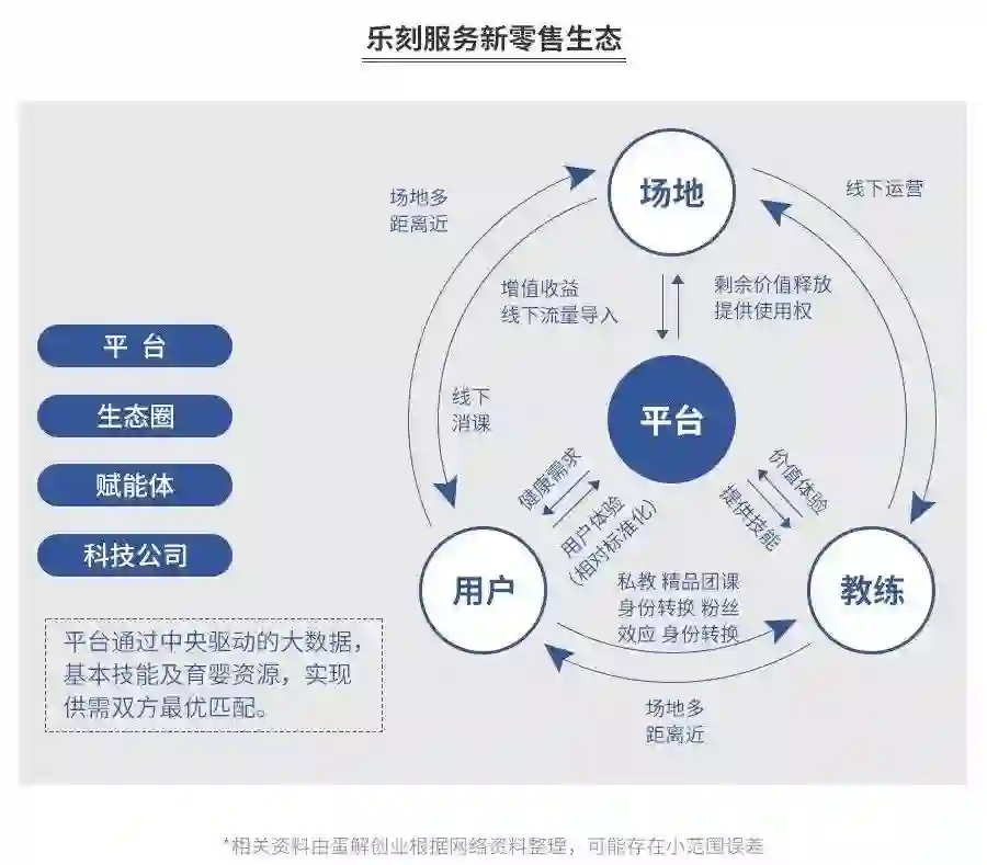 韩伟在接受媒体采访时就提到,乐刻是健身界的Uber,以消费者为中心建平台来串人货场三环,消费者是“人”,场地是“场”,教练是“货”,用平台去串。简单来说,乐刻就像淘宝一样,消费者就是买家,教练就是卖家。教练借助乐刻展示自己的专业能力和服务,靠口碑传播去获得更多的消费者。