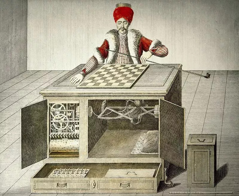 又过了几十年,在1770年,发明家沃尔夫冈·冯·肯佩伦(Wolfgang von Kempelen)臭名昭著的土耳其行棋傀儡首次公开。虽然很多人都怀疑它是一个骗局,但没有人能够说清楚其中到底有什么门道。直到1857年一篇揭秘文章指出,有一个人藏在装置内部暗中操控。