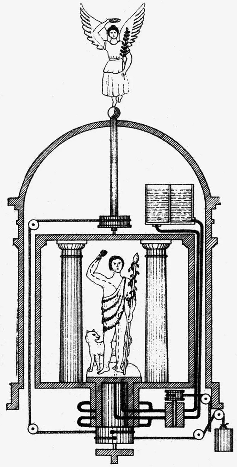 数学家兼工程师亚历山大港的希罗(Hero of Alexandria)也在其公元1世纪的专著《自动装置的制作》中描述了一个全自动化的木偶剧院,这个剧院通过谷物、轮轴、杠杆、滑轮和车轮的相互作用,可以上演一出完整的悲剧。