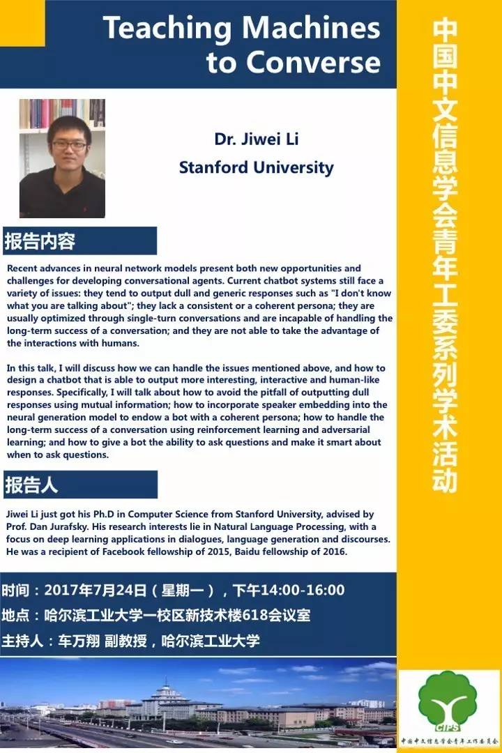 应哈尔滨工业大学社会计算与信息检索研究中心博士生导师车万翔副教授邀请,斯坦福大学李纪为博士将于7月24日14:00~16:00在哈尔滨工业大学一校区新技术楼618作题为《Teaching Machines to Converse》的报告。届时我们将在斗鱼网全程直播该报告,敬请大家观看!