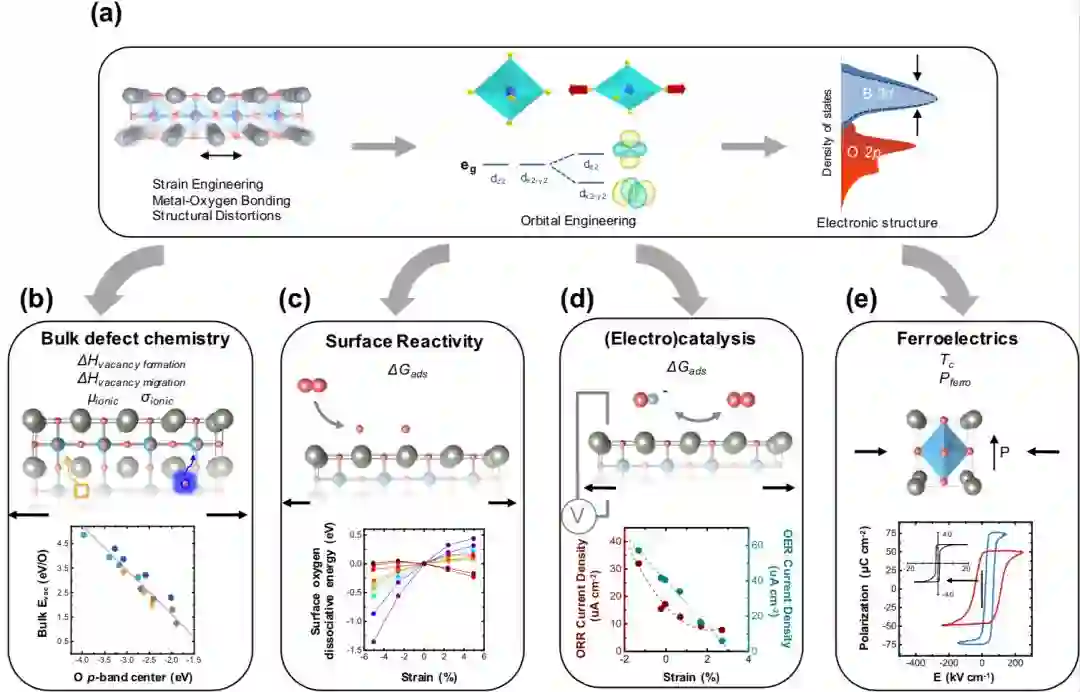 Figure 1. Interplay between strain in complex oxides, modification of electronic structure, and the resulting effect on oxide functionalities.